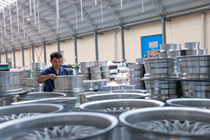 7月10日厦门股票配资开户,工人在山东省聊城市茌平区一家铝制品有限公司车间内搬运汽车零部件。(新华社)